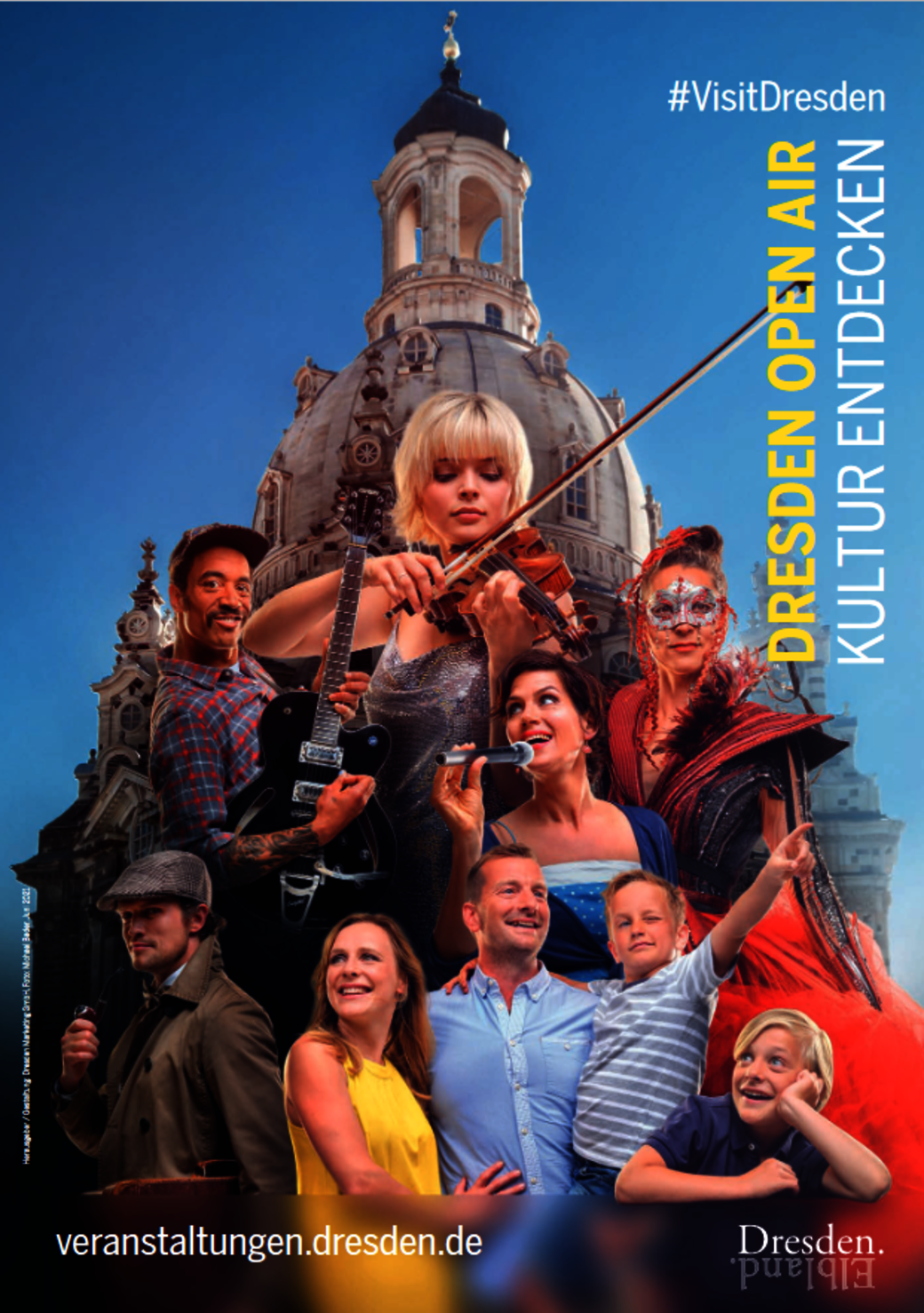 Die Stadt wirbt mit 250 City Light Plakaten für den „Dresdner Open Air - Kultursommer 2021“. Mutter, Vater und zwei Kinder – die Personen im vorderen Teil des aktuellen Motivs sind auch im echten Leben eine Familie und freuen sich auf Kultursommer im Zentrum der Stadt. Die Menschen dahinter stehen stellvertretend für die vielen Kunst- und Kulturschaffenden, die das mehrwöchige Kulturevent einzigartig werden lassen – Schauspieler, Musiker, Sänger und Akrobaten.