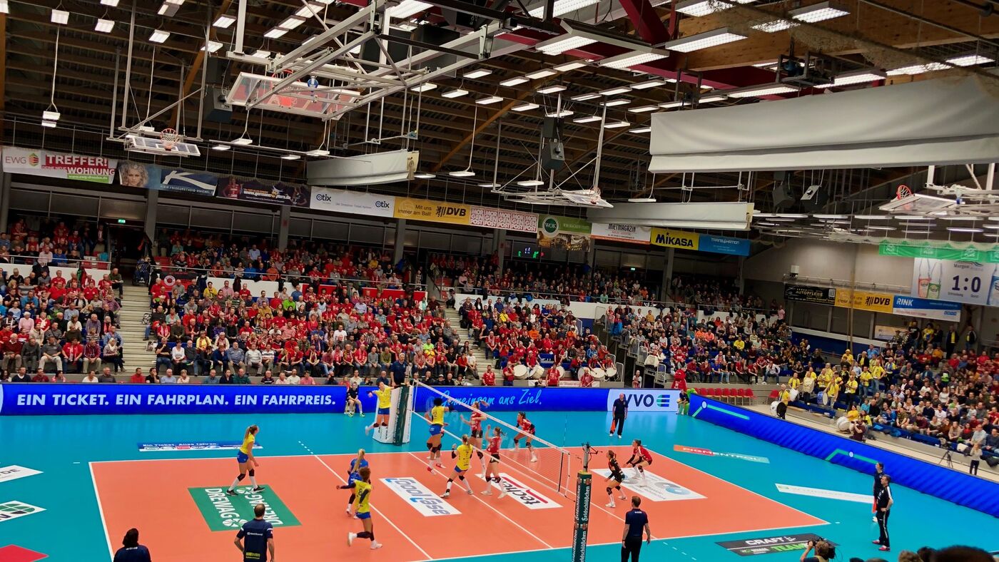 Im ersten Satz lieferten sich beide Teams lange Zeit einen Schlagabtausch auf Augenhöhe. Nach dem 18:18 setzte sich Schwerin dank druckvollem Angriffsspiel und sicherer Blockabwehr mit vier Punkten ab und entschied den ersten Satz für sich. Fast das gleiche Bild bot sich im zweiten Abschnitt. Bis zum 18:19 aus Sicht der DSC-Damen, die weiterhin auf die erkrankte Stammzuspielerin Mareen von Römer verzichten müssen, konnte sich kein Team einen entscheidenden Vorsprung verschaffen. Doch in der entscheidenden Schlussphase hatten die Gäste die besseren Lösungen im Angriff und auch in der Abwehr standen sie sehr stabil.