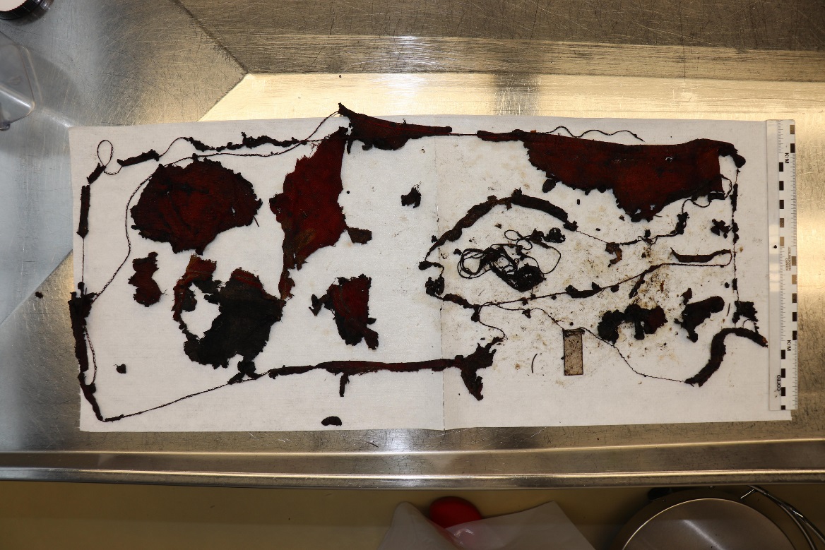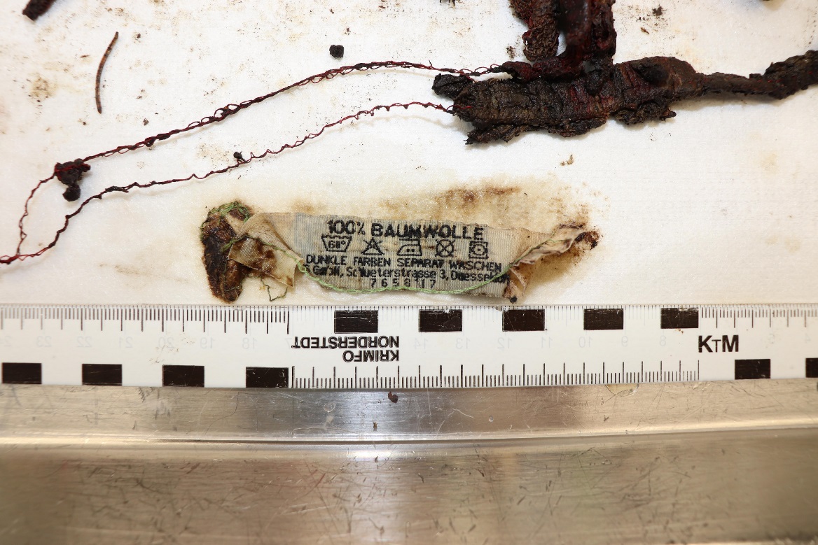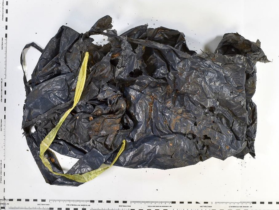 Dazu gehören ein blauer Plastikeimer mit rotem Henkel samt „markanter Kerbe“, ein schwarzer Müllsack, Kunststoffklammern, Textilreste, möglicherweise von Waschlappen oder Handtuch, und Etiketten.