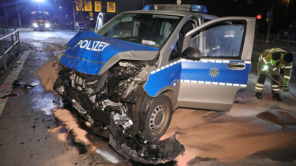 Nach dem Zusammenstoß schleuderte der Jeep gegen einen Ampelmast. Glücklicherweise gab es keine Verletzten. Der Streifenwagen soll nach Informationen unseres Reporters mit Sondersignal unterwegs gewesen sein.