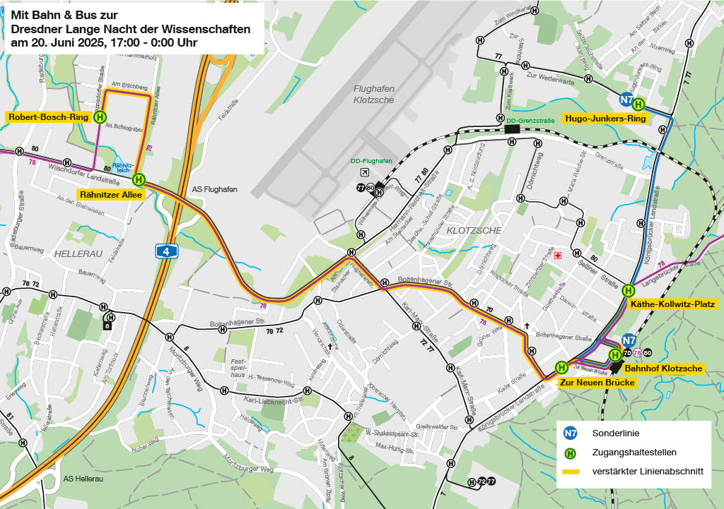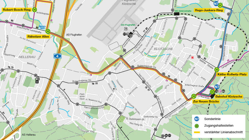 So pendelt eine Zusatzlinie N6 zwischen Münchner Platz und Felsenkeller im 30-Minuten-Takt. Die Zusatzlinie N7 bindet ebenfalls im 30-Minuten-Takt den Hugo-Junkers-Ring an den Bahnhof Klotzsche an. Zusätzliche Fahrten mit verlängerten Einsatzzeiten gibt es ebenfalls auf den Buslinien 78 im Norden und 85 im Südosten.