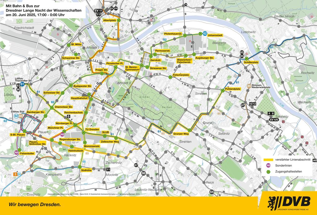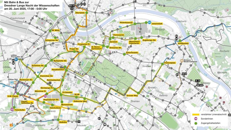 Auch die Linien 61, 62 und 66 werden verstärkt. Informationen zum Fahrplan gibt es unter www.vvo-online.de oder www.dvb.de.