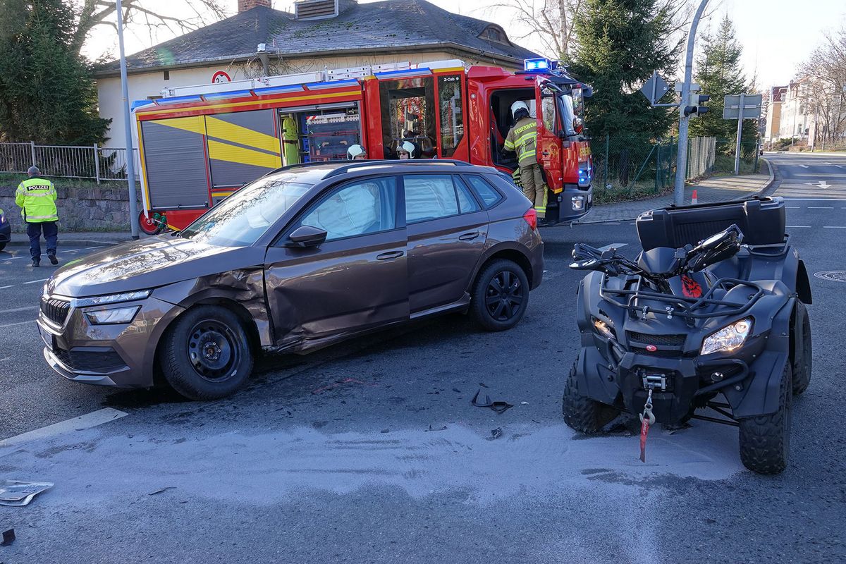 In Freital ist ein Quadfahrer am Dienstagvormittag bei einem Unfall schwer verletzt worden. Laut Polizei war der 55-Jährige auf der Oberpesterwitzer Straße unterwegs. An der Kreuzung Carl-Thieme-Straße stieß er mit einem Skoda-Fahrer zusammen. Der Quadfahrer kam mit schweren Verletzungen umgehend in ein Krankenhaus, der 73-jährige Skoda-Fahrer blieb unverletzt.