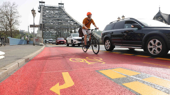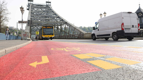 Eine Abbiegespur für Autofahrer weniger, dafür ein breit markierter Radstreifen: so soll es jetzt am Blauen Wunder in Dresden zwei Monate rollen. So zumindest die Vorstellung des grünen Verkehrsbürgermeisters Stephan Kühn. 70.000 Euro hat er für die Markierung ausgegeben. Dass es nicht rollt, zeigt sein Verkehrsversuch gleich am ersten Tag.