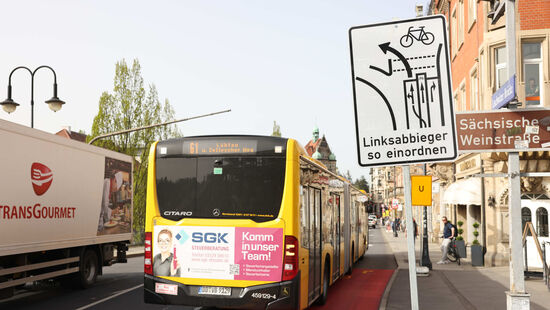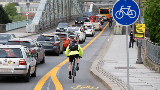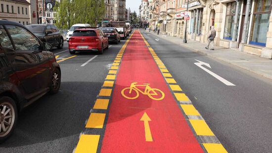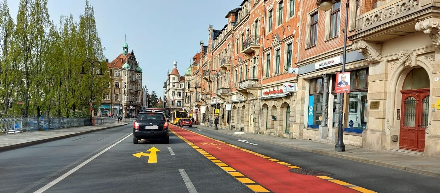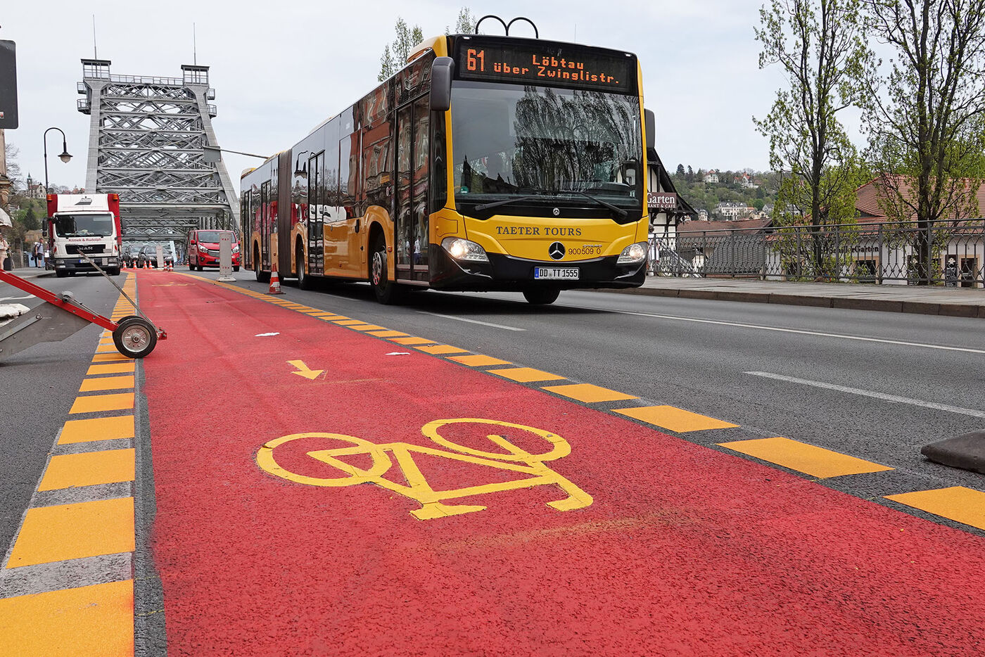 Der Radstreifen soll laut Stadt die Sicherheit von Radlern und Fußgängern erhöhen. Kritiker befürchten allerdings Staus für Autos und die Busse der Dresdner Verkehrsbetriebe (DVB).