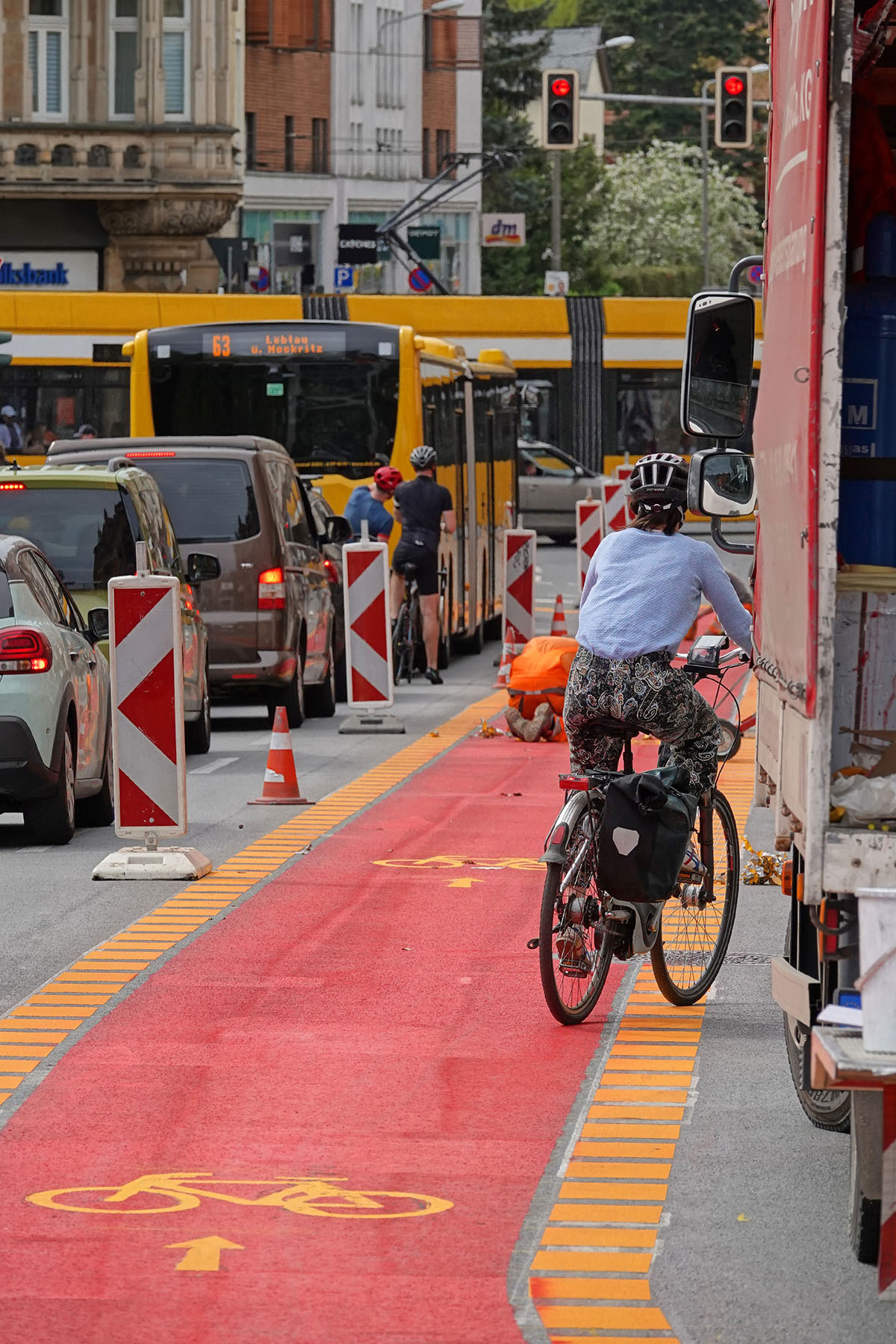 Während des Versuches laufen die gesamte Zeit wissenschaftliche Auswertungen. Im Fokus steht beispielsweise, ob weniger Radler auf den Gehwegen fahren, ob generell mehr Menschen auf das Rad umsteigen oder, wie lange die Busse und Autos früh in der Rush Hour benötigen.