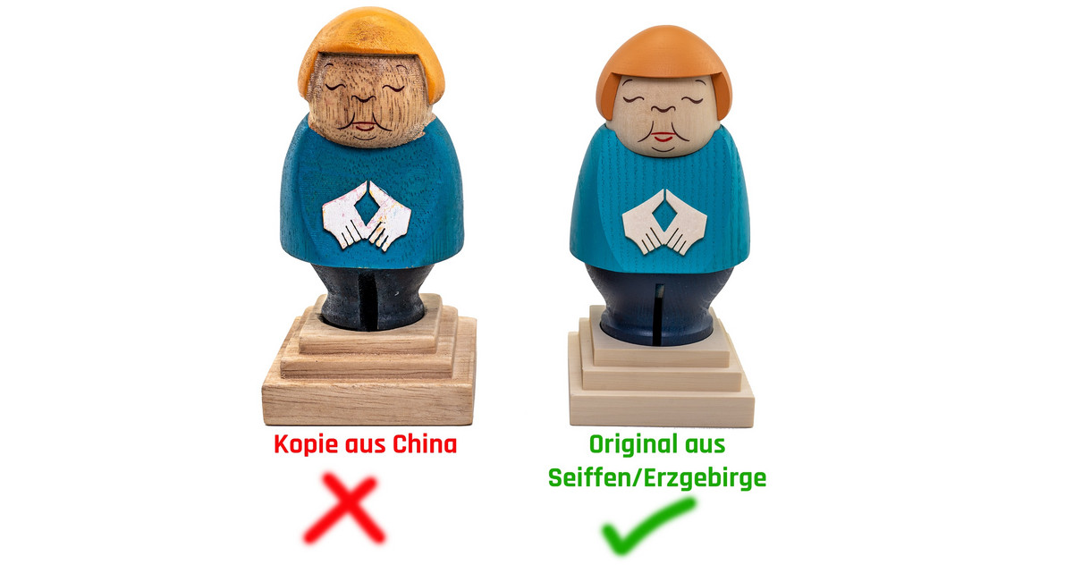 Die echt erzgebirgische Volkskunst hat immer mit Plagiaten zu kämpfen. Diesmal gibt es eine besonders dreiste Kopie von der bekanntesten Räucherfrau Deutschlands - Angela Merkel. Die Seiffner Volkskunst hat sie seit kurzem auf dem Markt. Ein Mitarbeiter entdeckte bei Amazon die Billigkopie. Die erinnert optisch nur in Form und Farbe an das Original.