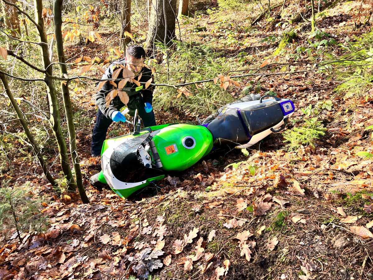 Bei der Suche nach ihm kamen ein Fährtenhund sowie ein Polizeihubschrauber zum Einsatz. In der Ortslage Lohmen konnte der 43-jährige Deutsche gestellt werden. Er hatte keine Fahrerlaubnis und stand unter Einwirkung von Betäubungsmitteln. Des Weiteren war die Kawasaki mit falschen Kennzeichen ausgestattet und es bestand keine Haftpflichtversicherung für das Fahrzeug. Gegen den Fahrer wurde ein Ermittlungsverfahren eingeleitet. Die Polizei sucht Zeugen, die durch die Fahrweise des Kradfahrers gefährdet bzw. geschädigt wurden.