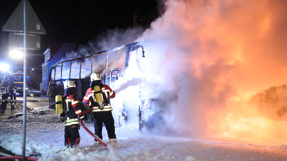 In Tharandt ist am Sonntagmorgen auf der Dresdner Straße ein Reisebus vollständig ausgebrannt. Alle 20 Fahrgäste - Mitglieder des FC-Bayern-Fanclubs aus Rabenau blieben unverletzt. Wie die Polizei mitteilte, hatte der Fahrer kurz nach 4 Uhr den Rauch im Heckbereich des Fahrzeugs bemerkt und hielt daraufhin an. Die Fahrgäste konnten alle unverletzt den Bus verlassen, bevor sich das Feuer auf das gesamte Fahrzeug ausbreitete. Während der Löscharbeiten und der Bergung musste die Straße zunächst voll gesperrt werden. Inzwischen ist sie wieder einseitig befahrbar - allerdings hat das Feuer Schäden an der Straße verursacht. Der Verkehr wird derzeit per Ampel geregelt. Nach ersten Erkenntnissen geht die Polizei von einem technischen Defekt aus.