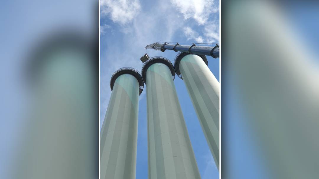 Aller zwei Jahre weden die drei markanten Schornsteine an der Nossener Brücke von externen Spezialisten inspiziert. An einem der Kamine waren die Routinearbeiten bereits im vergangenen Jahr erfolgt, so SachsenEnergie.