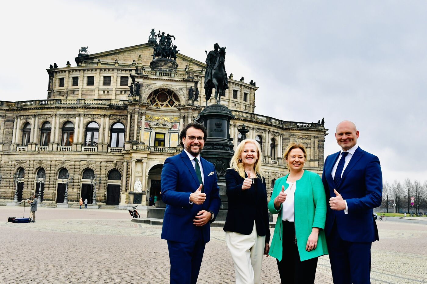 - Alexander Gutierrez Diaz, CEO der Dresdner Uhrenmanufaktur LANG & HEYNE, Ramona Nagel, Pressesprecherin IHK Chemnitz, Corinne Miseer, Geschäftsführerin der Dresden Marketing GmbH und Initiator Roland Hess