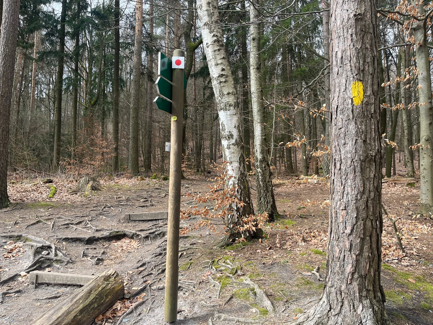 - Gelbe Farbstriche an den Bäumen markieren den Forststeig