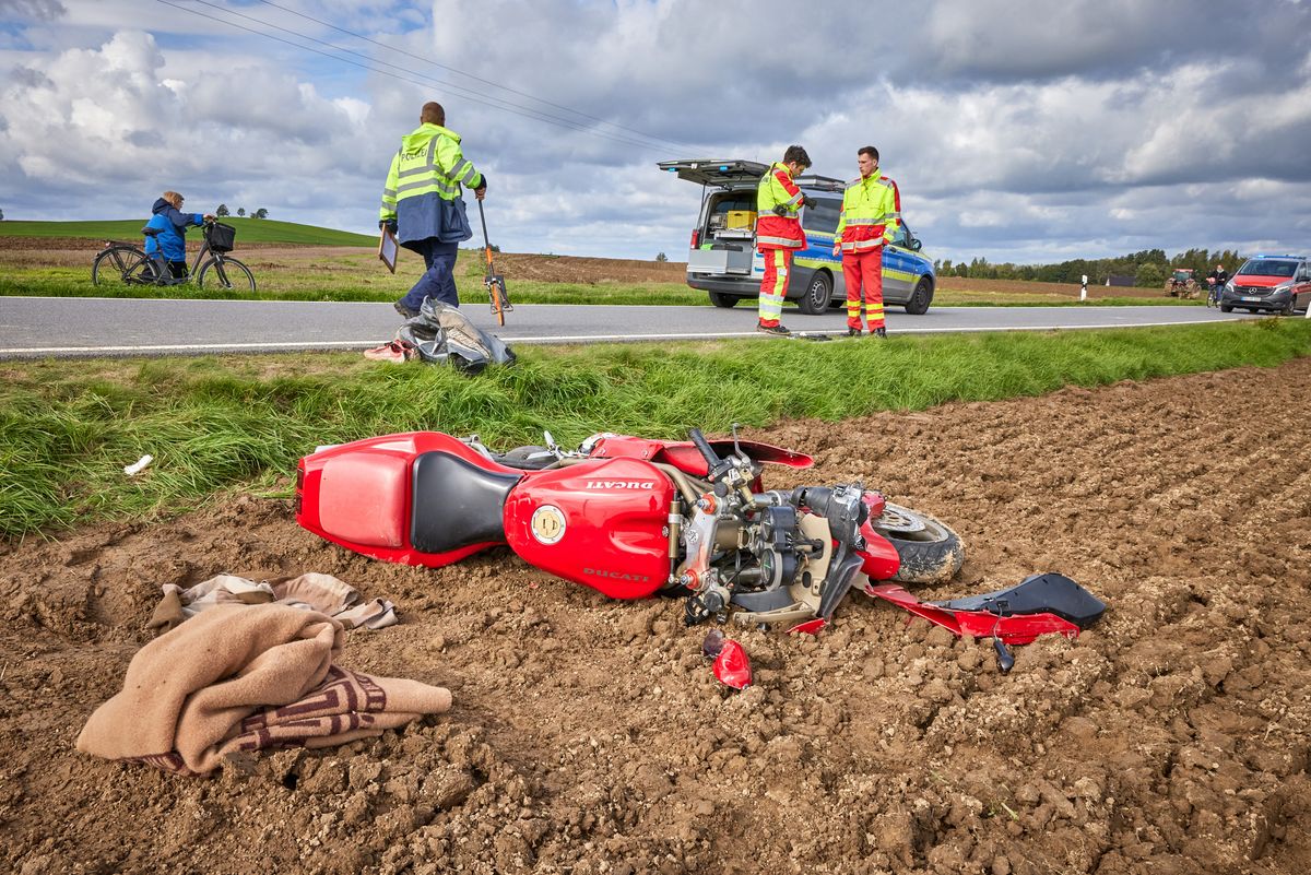 In einer Rechtskurve kam er auf die Gegenfahrbahn und stieß mit einem entgegenkommenden Renault seitlich zusammen. Daraufhin kam der 43-Jährige nach rechts von der Fahrbahn ab und fuhr rechts auf ein Feld. Dort kam die Maschine und der Fahrer zum Liegen. Der Motorradfahrer wurde dabei schwer verletzt.