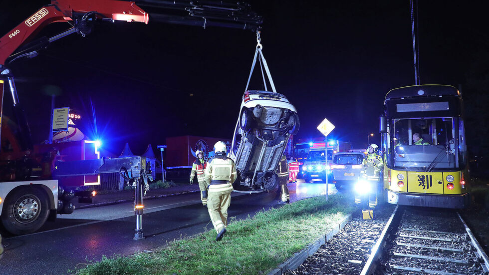 Das Auto wurde von einer Bahn der Linie 8 erfasst, die den Wagen noch etwa 15 Meter vor sich her schob. Die Fahrerin wurde eingeklemmt und schwer verletzt.