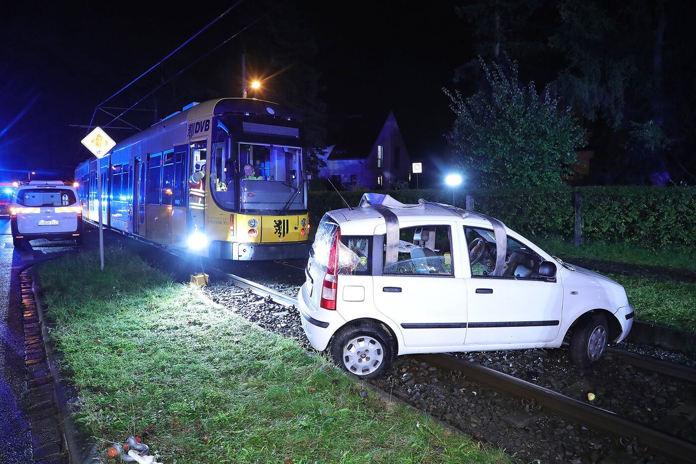 Das Auto wurde von einer Bahn der Linie 8 erfasst, die den Wagen noch etwa 15 Meter vor sich her schob. Die Fahrerin wurde eingeklemmt und schwer verletzt.
