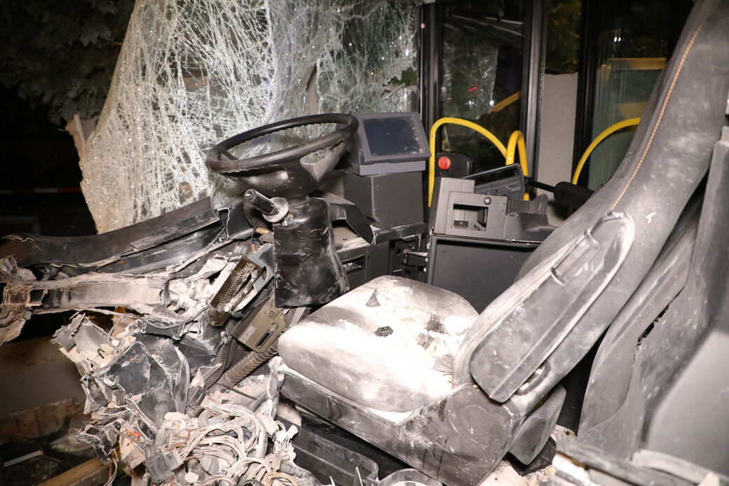 Der Busfahrer wurde eingeklemmt. Die Feuerwehr musste den 39-Jährigen aus der nahezu zertrümmerten Fahrerkabine befreien. Er kam nach Angaben eines Polizeisprechers mit schweren Verletzungen ins Krankenhaus. Zwei Insassen im Bus, ein 27-Jähriger und ein 37 Jahre alter Mann, wurden leicht verletzt.