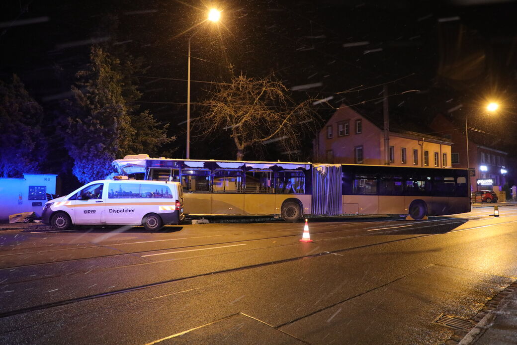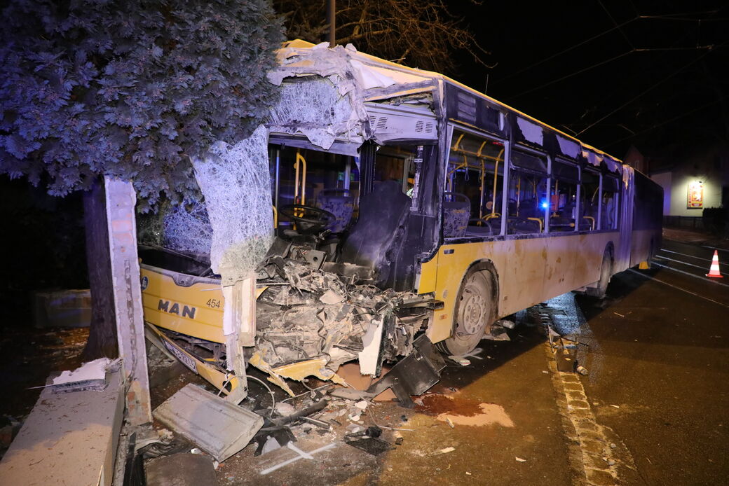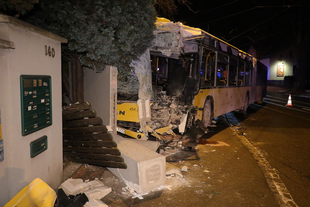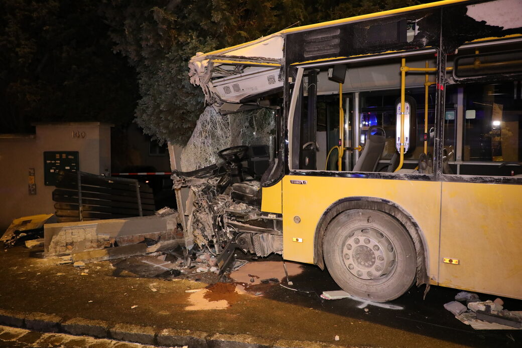 In Dresden-Bühlau ist in der Nacht zum Montag ein Linienbus verunglückt. Nach ersten Informationen krachte der Bus der Linie EV 11 gegen 02.15 Uhr auf der Bautzner Landstraße (B6) in Höhe der Kirschauer Straße gegen die Hauswand einer Bäckerei, fällte einen Strommast und kollidierte mit einer Mauer.