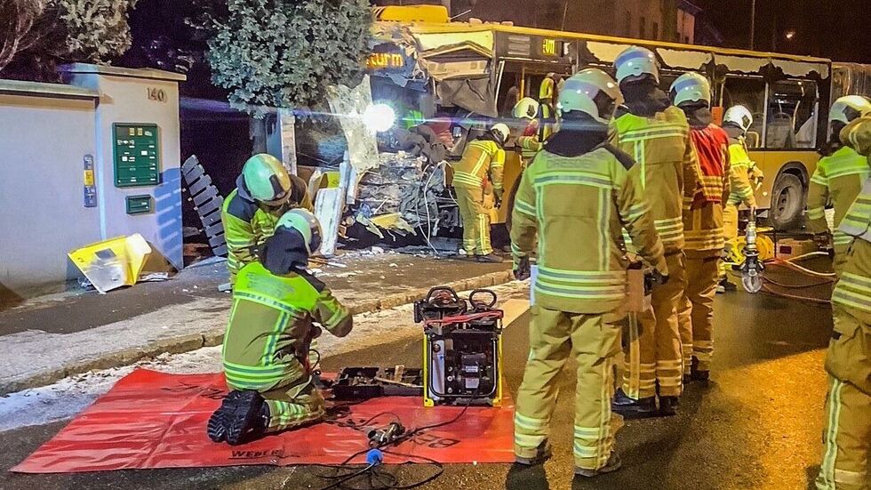 Der Busfahrer wurde eingeklemmt. Die Feuerwehr musste den 39-Jährigen aus der nahezu zertrümmerten Fahrerkabine befreien. Er kam nach Angaben eines Polizeisprechers mit schweren Verletzungen ins Krankenhaus. Zwei Insassen im Bus, ein 27-Jähriger und ein 37 Jahre alter Mann, wurden leicht verletzt.