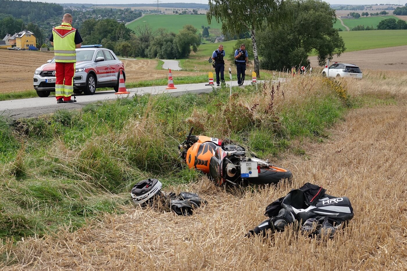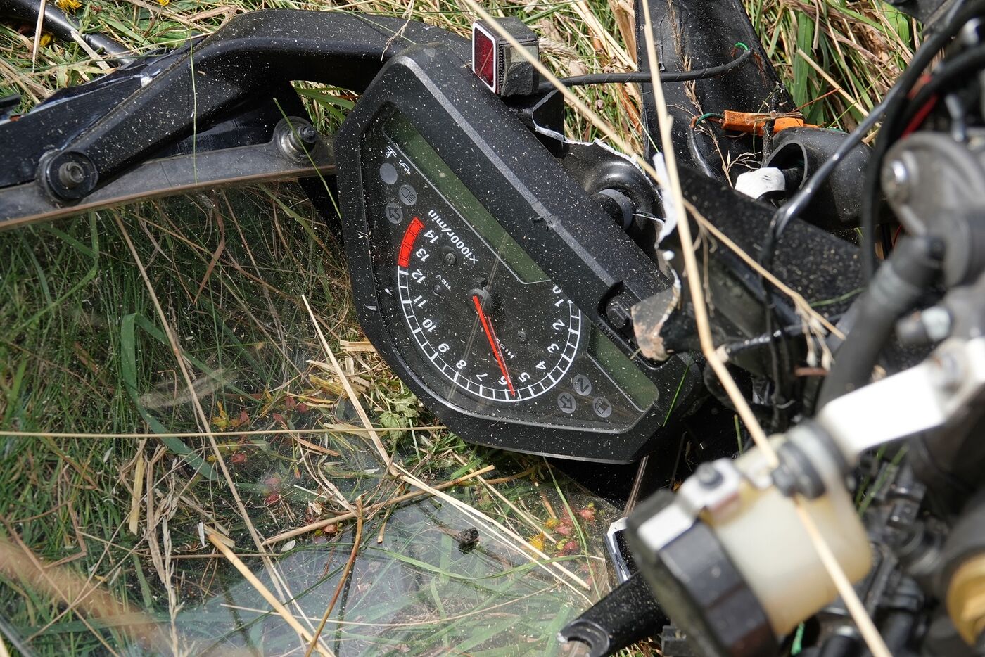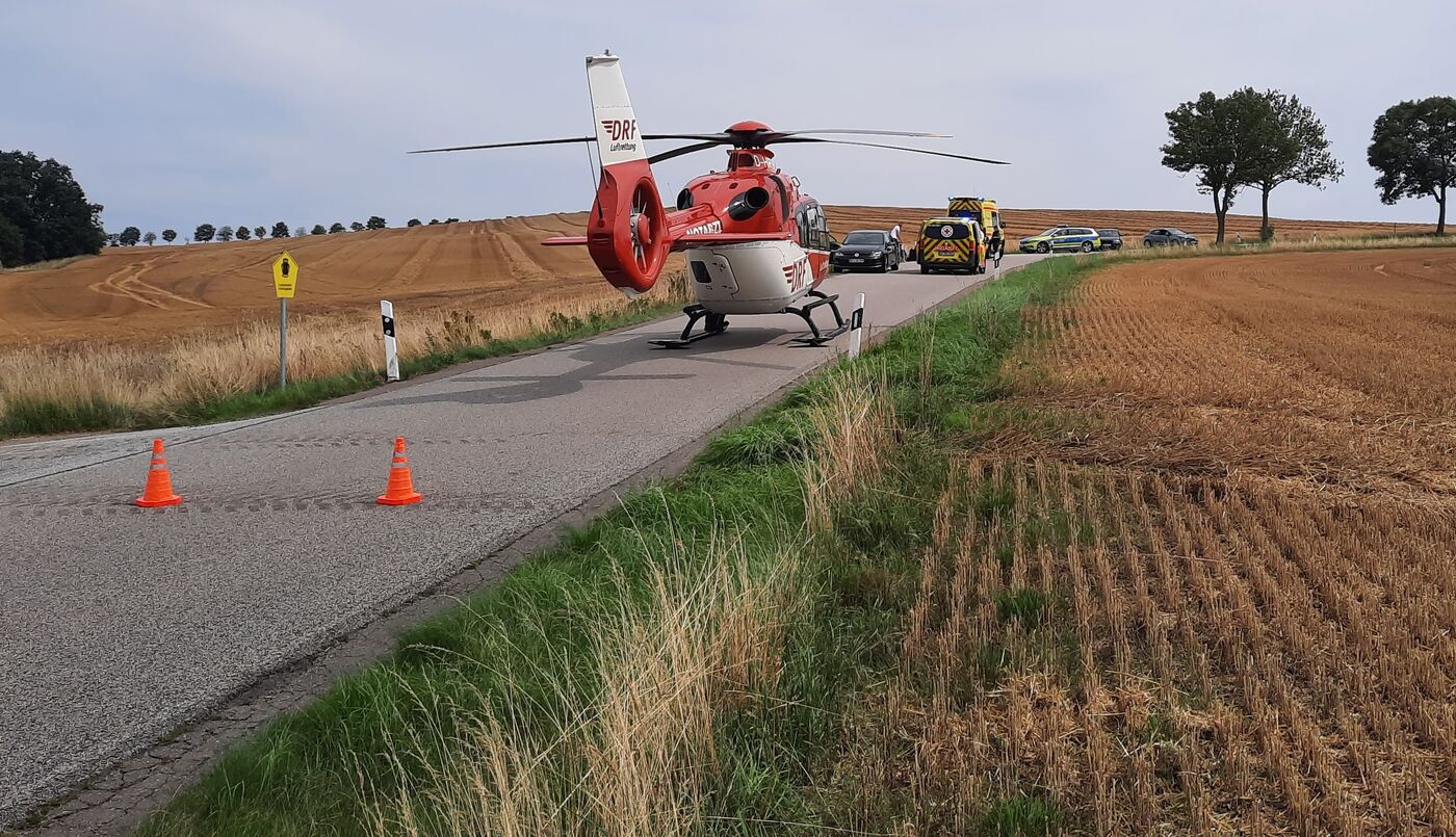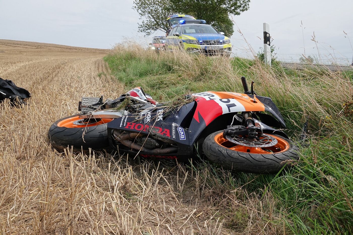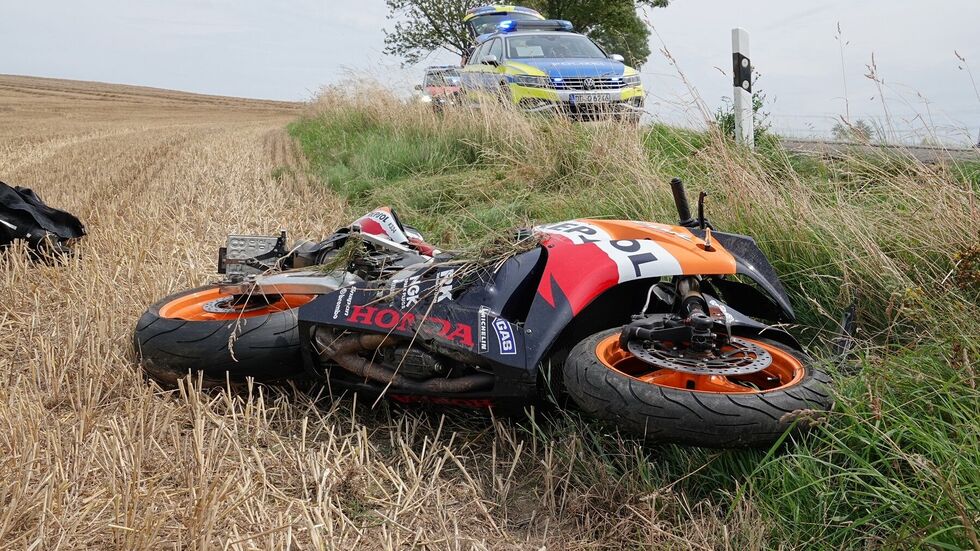 Im Graben überschlug sich die Maschine wahrscheinlich. Am Ende blieben Motorrad und Fahrer auf einem Feld liegen. Der 55-jährige Motorradfahrer wurde schwer verletzt und mit dem Rettungshubschrauber ins Krankenhaus geflogen. Das Motorrad wurde schwer beschädigt.
