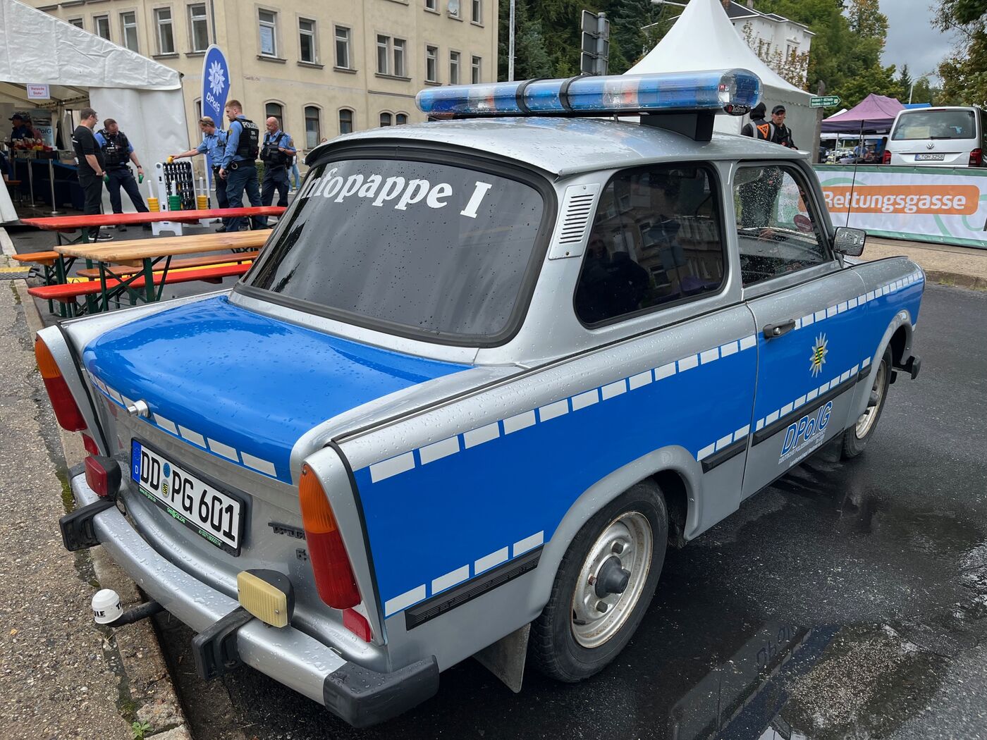 - Der Polizei-Trabi, die sogenannte "Infopappe", steht direkt an der Blaulichtmeile