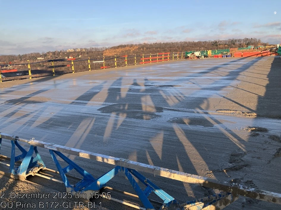 Rüdiger Miertschink: „Die Arbeiten laufen seit dieser Woche wieder. Wir sind aktuell dabei, ein weiteres Stück der Fahrbahn auf der Gottleubatalbrücke zu betonieren. Und wir hoffen sehr, dass das Wetter einigermaßen stabil bleibt und wir unsere Arbeiten zielgerichtet fortsetzen können. Wenn alle Maßnahmen, die wir uns zur Optimierung des Bauablaufs überlegt haben, passen, und nicht nochmal eine Frostperiode kommt, dann ist der Termin zur Verkehrsfreigabe Ende 2026 realistisch.“
