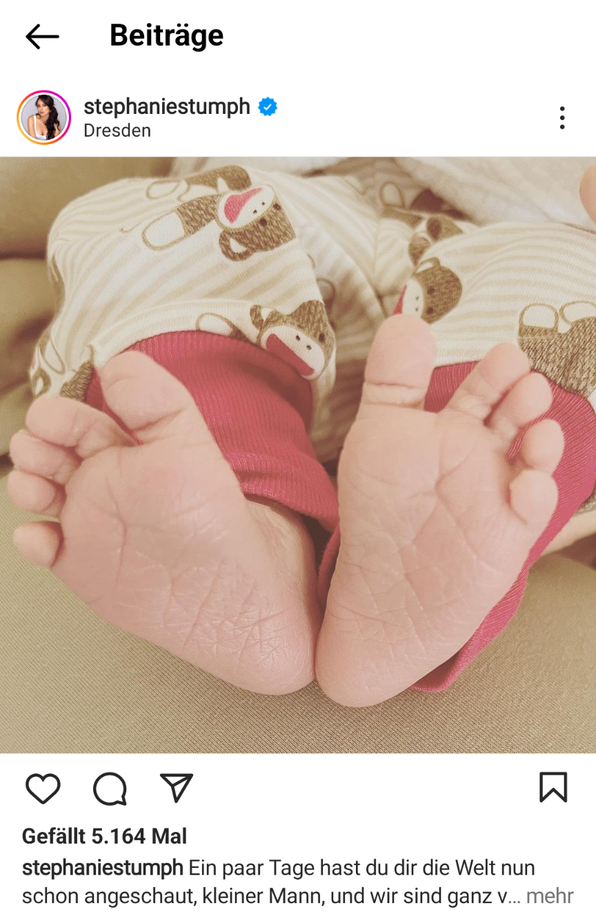 Schauspielerin Stephanie Stumph („Der Alte“, „Stubbe - Von Fall zu Fall“) hat ihr erstes Baby bekommen. Zu einem Bild, auf dem Baby-Füße zu sehen sind, schrieb die 37-Jährige am Donnerstagabend auf Instagram: „Ein paar Tage hast du dir die Welt nun schon angeschaut, kleiner Mann, und wir sind ganz verliebt in dich.“ In einem mit „Ab nach Hause“ betitelten Video richtete sie ein Dankeschön für die tolle Betreuung an das Geburts- und Hebammenteam des Universitätsklinikums Dresden. Zu den ersten Gratulanten gehörten ihre TV-Kolleginnen Felicitas Woll, Susan Sideropoulos, Frauke Ludowig sowie Schauspieler Tom Wlaschiha („Stranger Things“).
