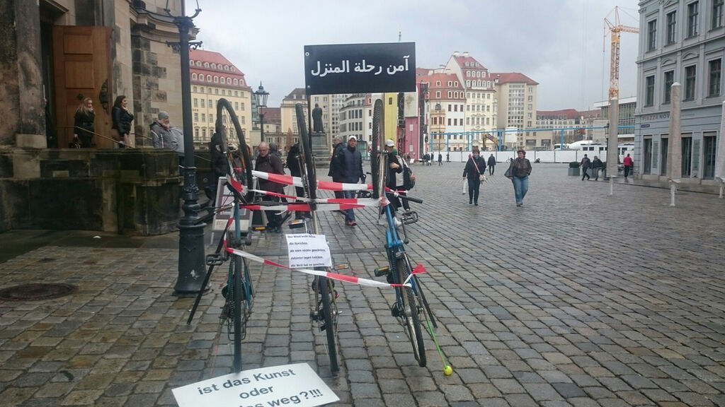 Die Stadt Dresden prüft weiterhin wegen der Banner-Protestaktion am Neumarkt Anzeige zu erstatten. Stadtsprecher Karl Schuricht hatte zunächst auf unsere Anfrage am Montavormittag gesagt, es sei nun Anzeige erstattet worden. Später revidierte Schuricht diese Aussage. Es würde weiter geprüft, ob Anzeige erstattet wird. "Diese ist noch nicht rausgegangen", sagte Schuricht. Nähere Angaben ob und wann dies erfolgen soll, konnte Schuricht nicht machen.Die Stadt prüft, ob Anzeige wegen Amtsmissbrauches oder Urkundenfälschung erstattet wird. Bereits vergangene Woche hatte Schuricht eine Prüfung der Anzeige angekündigt.Die Identitäre Bewegung, die vom Verfassungsschutz beobachtet wird, hatte vor zwei Wochen mit einer Hebebühne ein Protest-Banner an den drei hochkant stehenden Bussen angebracht. Wie ein Video der Initiatoren zeigt (Abzurufen unter bit.ly/2lTbxAU), hatte die Gruppe ein gefälschtes Schreiben vorbereitet, um dieses bei Rückfragen vor Ort vorzuzeigen. Demnach sei man angeblich von der Stadt für die Arbeiten vor Ort beauftragt worden. Der entsprechende Brief war gefälscht. Das Banner ist drei Stunden nach der Aktion von der Stadt abgenommen worden. Zunächst hatte die Stadt zurückhaltend auf die Aktion reagiert.Weitere Protestaktion am NeumarktUnterdessen ist am Montagnachmittag auf dem Neumarkt eine weitere Protestaktion gestartet worden. Drei Fahrräder wurden vor der Frauenkirche hochkant aufgestellt, dazu der Spruch "ist das Kunst oder soll das weg". Nach Angaben von Beobachtern vor Ort soll die Pegida-Rednerin Thea M. beteiligt gewesen sein. Die Polizei prüft den Vorfall, verwies allerdings in einer ersten Reaktion auf Zuständigkeit der Stadtverwaltung. Später teilte Polizeisprecherin Jana Ulbricht mit, man habe die Stadt informiert. Diese kümmere sich nun darum.Das Buskunstwerk steht noch vier Wochen auf dem Neumarkt.Update 16:55 Uhr: Zunächst wurde unserer Redaktion am Montagvormittag mitgeteilt, dass nun Strafanzeige erstattet worden sei. Am Nachmittag revidierte sich ein Stadtsprecher, der Vorgang werde weiter geprüft.