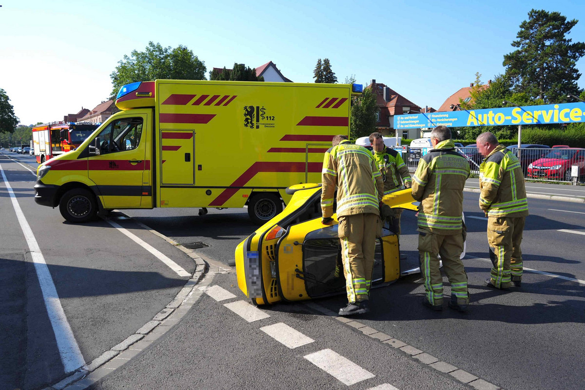 Der 51-jährige Fahrer wurde durch den Unfall verletzt und kam zur Behandlung in ein Krankenhaus. Die Feuerwehr Dresden kümmerte sich währenddessen um den kleinen PKW und richtete den „Threewheeler“ wieder auf.