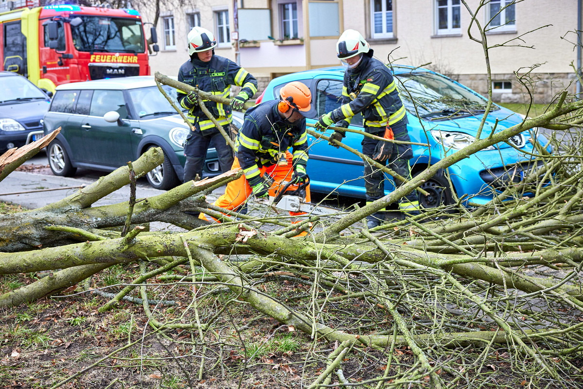 Auf der Elsterwerdaer Straße in Prohlis ist ein Baum auf mehrere Autos gekracht. Auf der Fritz-Reuter-Straße in der Dresdner Neustadt stürzte eine Satellitenschüssel ab. Beim Kaufland auf der Borsbergstraße in Striesen musste die Feuerwehr das Dach sichern, bei einem im Bau befindlichen Haus auf der Bergmannstraße ebenfalls. Auch Verkehrszeichen, Werbetafeln und Verkleidungen von Baugerüsten seien in der Landeshauptstadt fortgeweht worden, teilte die Feuerwehr mit.