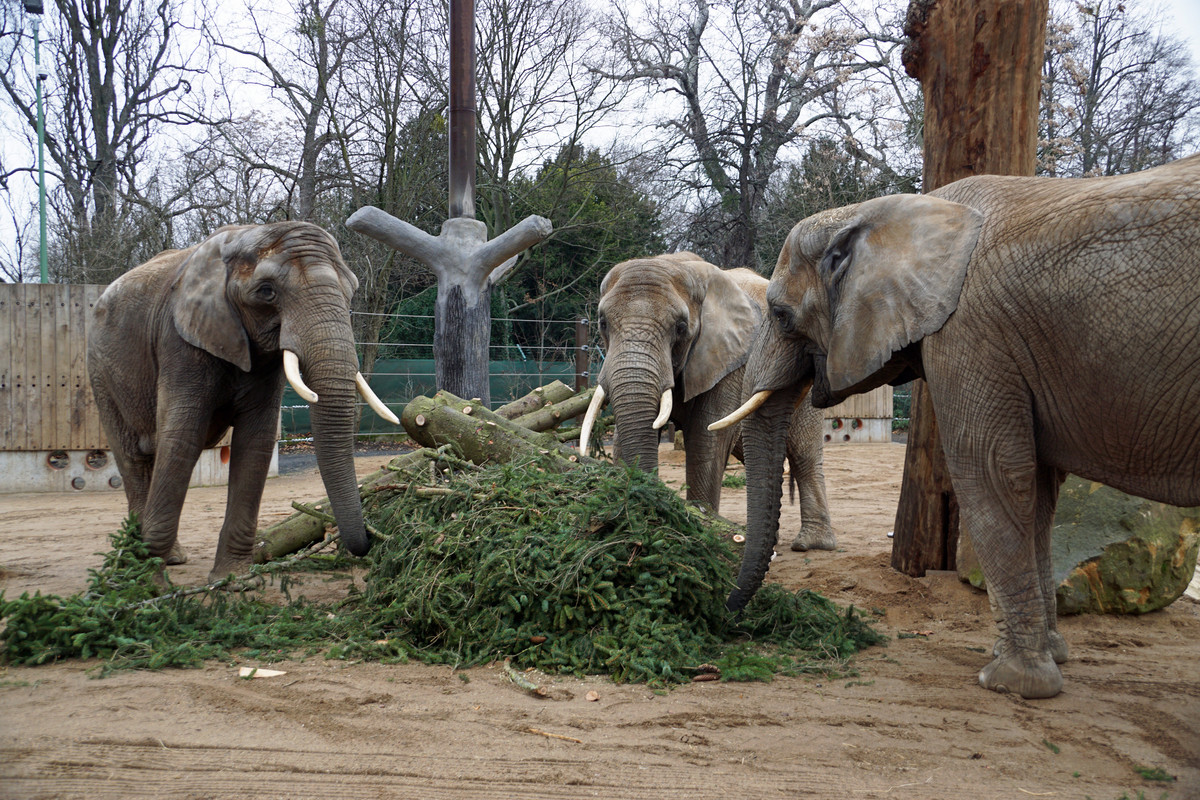 Elefanten sind Laub- sowie Holzfresser und freuen sich daher besonders, wenn es auch in der kalten Jahreszeit frische Koniferen gibt. Kein Wunder, dass sich die „Riesen“ trotz des ungemütlichen Wetters begeistert über die Tanne hermachten. Auch andere Tiere im Zoo freuen sich über die „recycelten“ Weihnachtsbäume. So mögen die Löwen zum Beispiel den Duft der Nadelbäume.