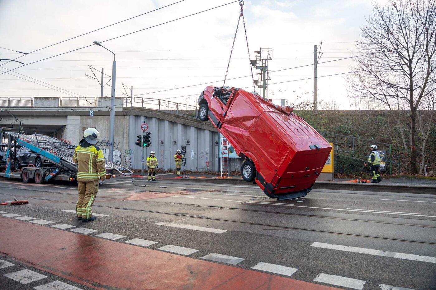 Kurz nach Mittag krachte es gewaltig an der Bahnunterführung am Bahnhof Dresden-Trachau. Ein LKW-Autotransporter übersieht oder ignoriert die Höhenbeschränkung der Unterführung.