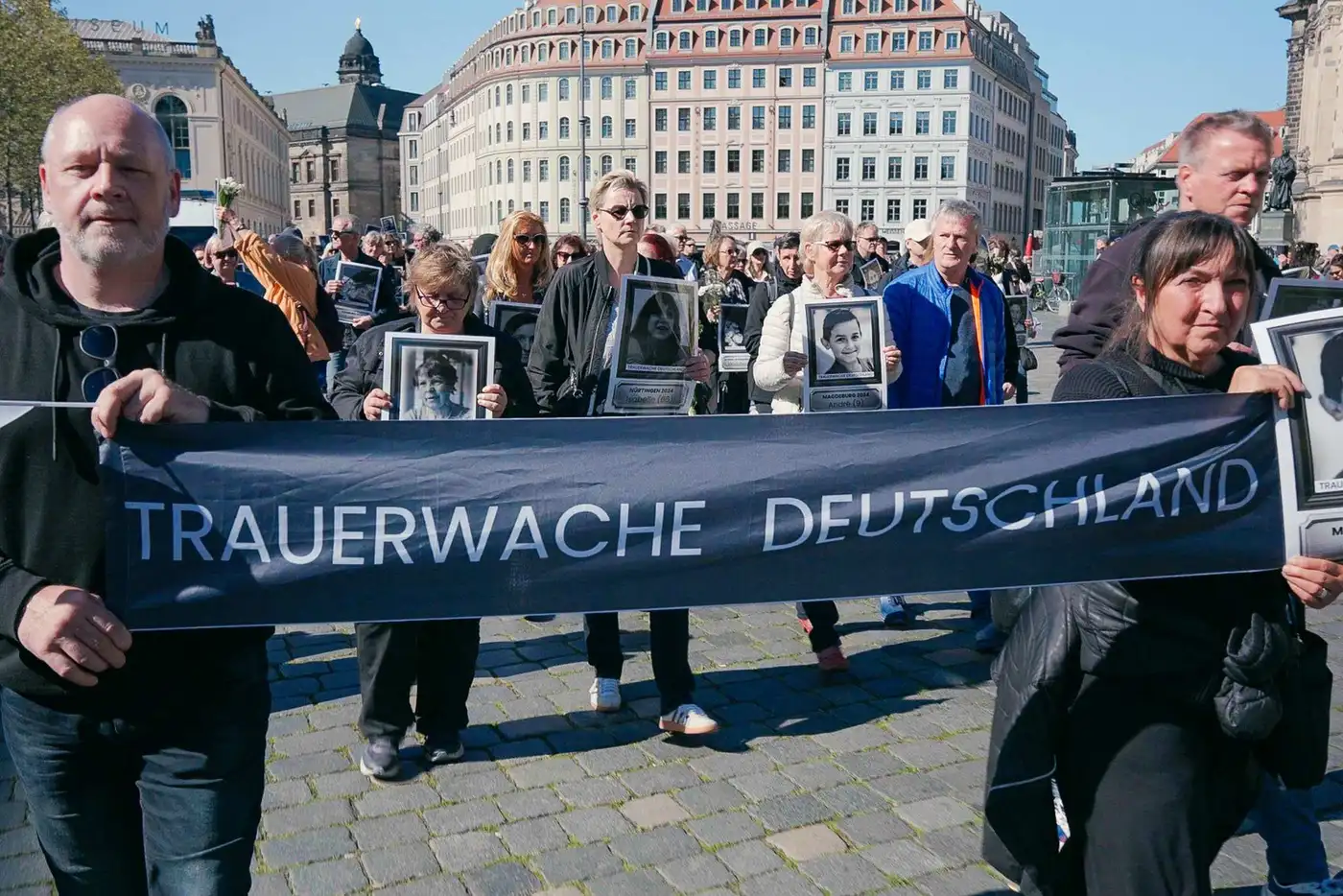 Hunderte Menschen haben am Samstagnachmittag in Dresden der Opfer von Attentaten und Anschlägen seit 2015 gedacht. Etwa 500 Teilnehmer waren dem Aufruf der Trauerwache Deutschland gefolgt, die den Fokus vor allem auf die Todesopfer von Gewalttaten durch Migranten richtet. Mit Fotos und Blumen zog der Trauermarsch vom Neumarkt aus durch Dresden. Mitinitiator Michael Kyrath führte die Trauerwache an. Seine 17-jährige Tochter Ann-Marie und ihr Freund wurden 2023 in einem Regionalzug von Kiel nach Hamburg von einem staatenlosen Palästinenser getötet.