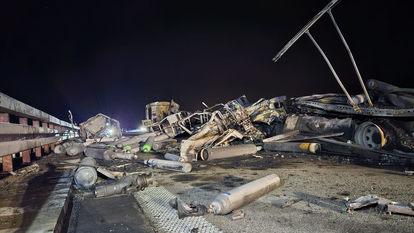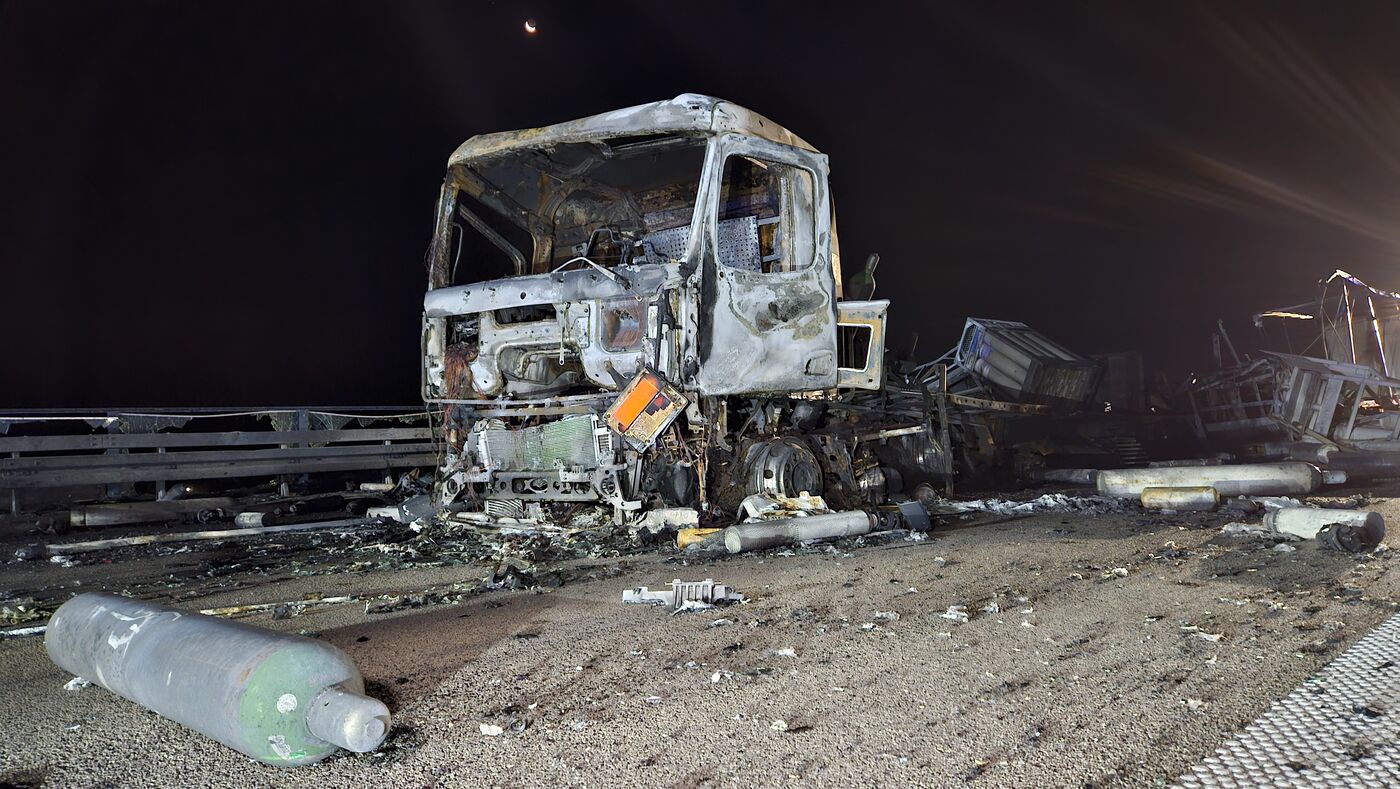 Etwa zwei Stunden später krachte auf der Saalebrücke bei Schkortleben ein Lkw ins Ende des sich gebildeten Staus auf einen weiteren Laster. Mehrere Gasflaschen explodierten dabei, beide Fahrzeuge brannten teilweise aus. Dazu seien mehrere Gasflaschen auf angrenzende Felder geflogen und hätten auch die noch in Brand gesetzt.