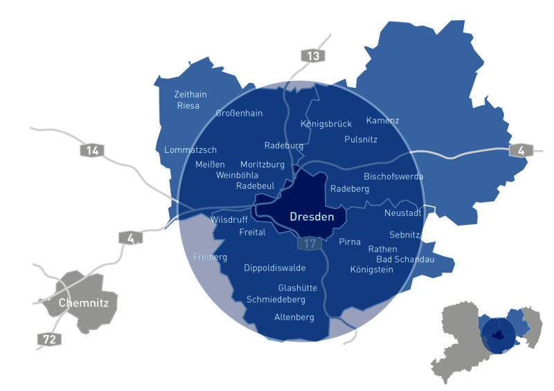 Radio Dresden hören Sie sowohl im Stadtgebiet Dresden inkl. Umland als auch in den Landkreisen Meißen und Sächsische Schweiz-Osterzgebirge sowie in Teilen der Landkreise Mittelsachsen, Bautzen, Oberspreewald-Lausitz und Elbe-Elster. Auf unserer Karte sehen Sie, mit welcher Frequenz Sie uns in welchem Gebiet empfangen können.