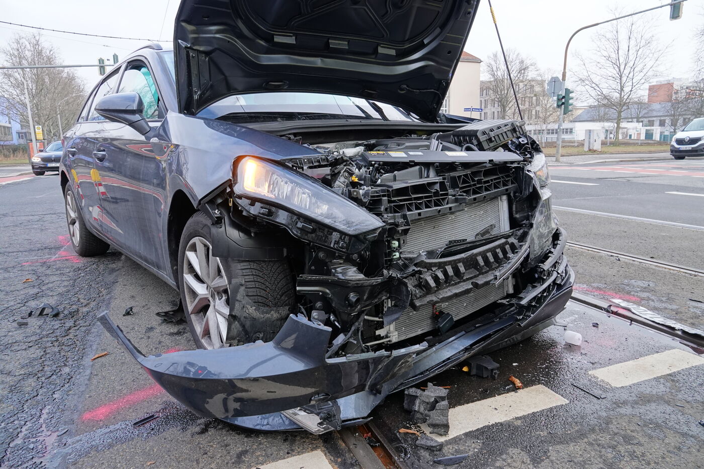Die Seatfahrerin (mit Kind im Auto) muss den Rettungswagen dennoch übersehen haben. Die Insasssen beider Fahrzeuge erlitten bei dem Zusammenprall leichte Verletzungen und mussten vor Ort medizinisch betreut werden und kamen anschließend ins Krankenhaus. In beiden Fahrzeugen gingen die Airbags auf, es entstand erheblicher Sachschaden.