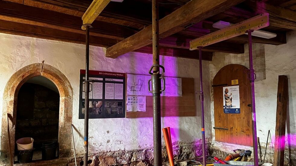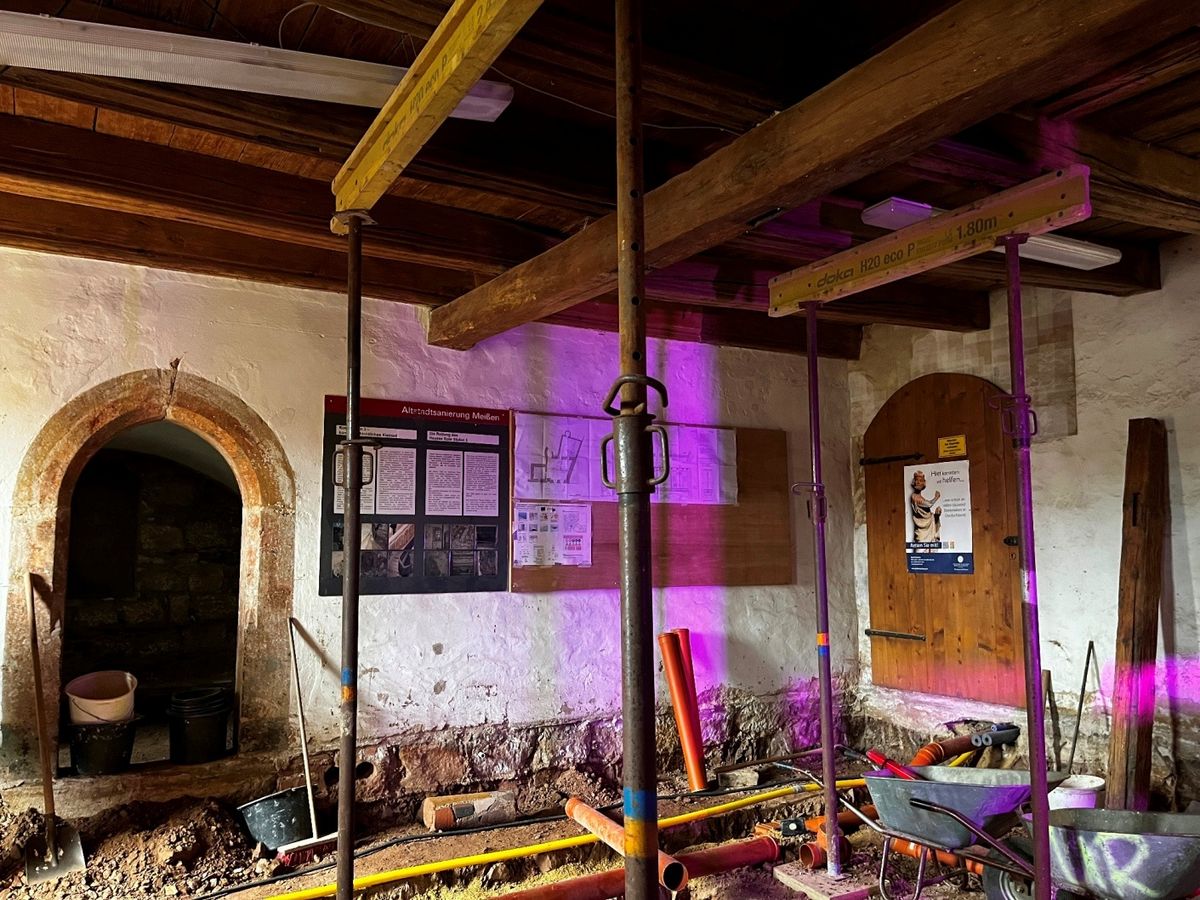 Die historische Decke und das Fundament werden erneuert, gleichzeitig verlegen die Arbeiter überall neue Leitungen. Das dreigeschossige Gebäude mit spätgotischem Giebel und wertvollen Wandmalereien stammt aus dem Jahr 1510. Jahrelang war es vom Verfall geprägt. Erst 2020 hatte die Stadt Meißen das Vorhaben wieder in ihre Hände genommen.