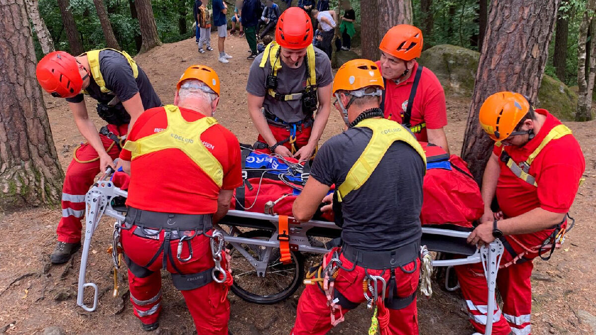 Die Bergwacht ist in den vergangenen Tagen - trotz Regenschauern und eher trübem Wetter - stark gefordert wurden. Allein am Dienstag wurden sie zu drei Einsätzen alarmiert. So rückten sie am Dienstagvormittag zu der Felsenburg Neurathen, auf dem Wanderweg zwischen Rathen und der Bastei aus. Wie unser Reporter berichtete, hatte ein Wanderer aus den Niederlanden eine Stufe übersehen und war daraufhin gestürzt. Der 73-Jährige konnte nicht mehr weitergehen und wurde per Gebirgstrage zu einem Krankenwagen transportiert. Von dort aus ging es für ihn in eine Klink.