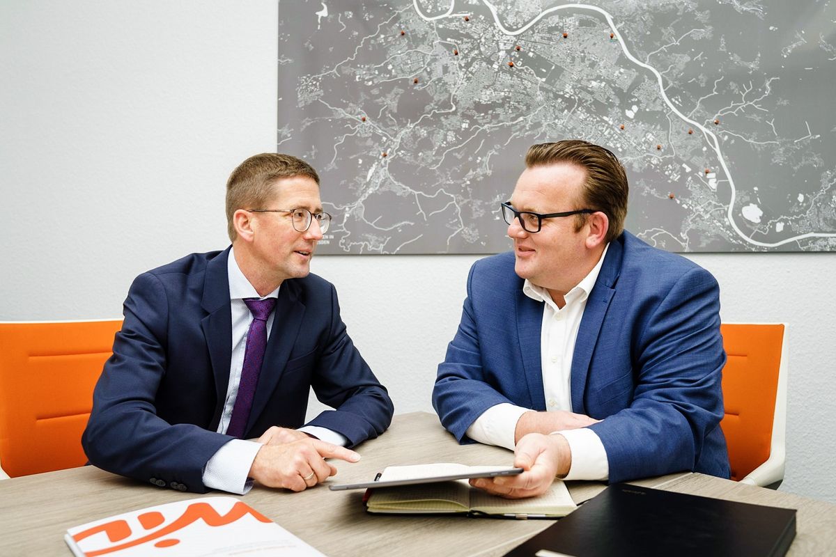 - Sebastian Krüger (rechts), Regionalbereichsleiter Vonovia Dresden übergibt das Portfolio für einen möglichen Ankauf an WiD-Geschäftsführer Steffen Jäckel (links)