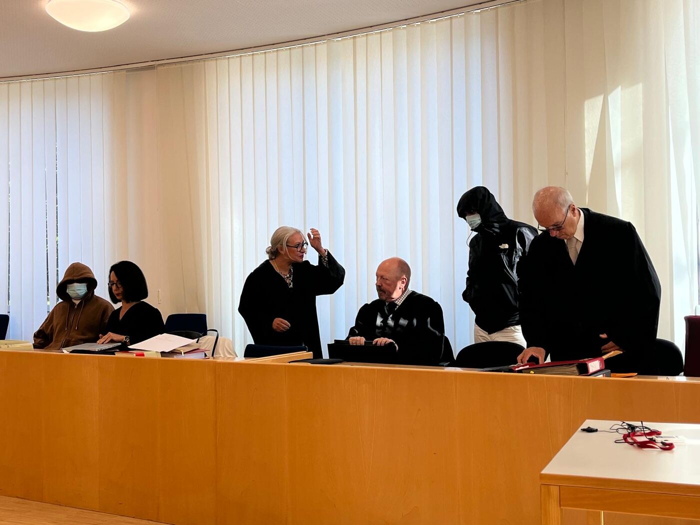 - Die Angeklagten erschienen mit Sonnenbrillen und Mundschutz vor Gericht, daneben die Verteidiger