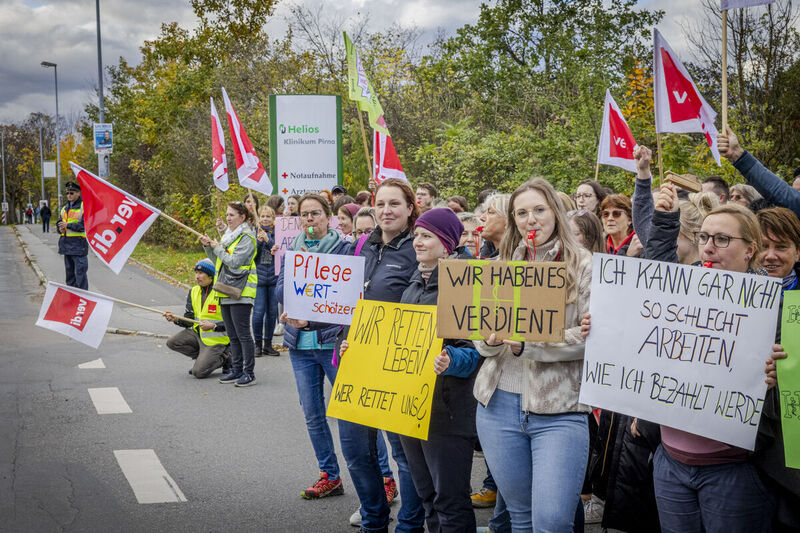 Mehr als 270 Beschäftigte am Helios Klinikum Pirna sind am Dienstag einem Streikaufruf der Gewerkschaft Ver.di gefolgt. Sie wollen ihre Arbeit ganztägig bis 23 Uhr niederlegen. Nach drei gescheiterten Verhandlungsrunden soll so der Druck erhöht werden. Gefordert werden 10,5 Prozent, mindestens aber 500 Euro mehr Lohn. Auch die Azubi-Gehälter sollen um 200 Euro monatlich steigen und es soll Verbesserungen im Urlaubsbereich geben.