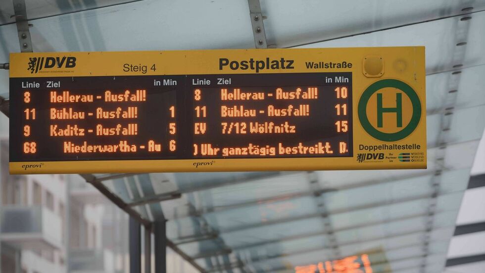 Der Streikaufruf der Gewerkschaft Verdi hat am Mittwoch zu 100 Prozent die Belegschaft der Dresdner Verkehrsbetriebe erreicht. Alle Straßenbahnen seien gegen 9 Uhr eingerückt, sagte uns ein DVB-Sprecher. Seitdem dreht sich auf den Gleisen kein Rad. Bei den Bussen sind nur die Subunternehmen unterwegs. So fährt zum Beispiel die Linie 65 fast durchgängig, und auch auf der 61 sind einige Busse von Fremdfirmen im Einsatz. Die DVB rechnen damit, dass ab Donnerstagfrüh wieder alles planmäßig fährt. Mehr Infos gibt es hier.