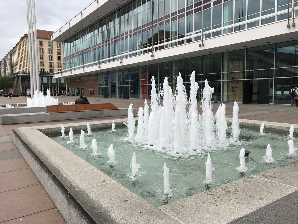 Ob die Wasserbecken vor dem Kulturpalast sprudeln können, wird derzeit im Zusammenhang mit der Kunstinstallation "Pop Up Green" mit der Dresdner Philharmonie geprüft.