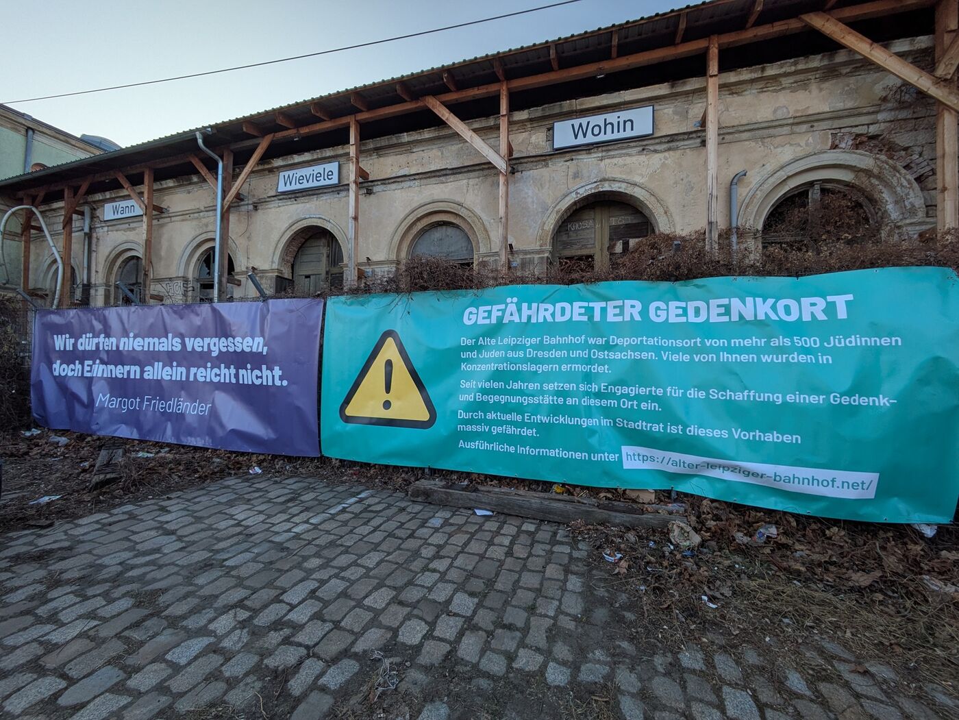 Ein Transparent mit den Worten von Margot Friedländer hängt seit dem 21.01.26 am Alten Leipziger Bahnhof. Es wurde am 84. Jahrestag der ersten Deportation Jüdischer Menschen von hier in den Tod, dort angebracht. Ein zweites Transparent verweist darauf, dass aktuelle Entwicklungen im Stadtrat die Schaffung eines Ortes des Gedenkens, der Bildung und Begegnung an dieser Stelle in Frage stellen.