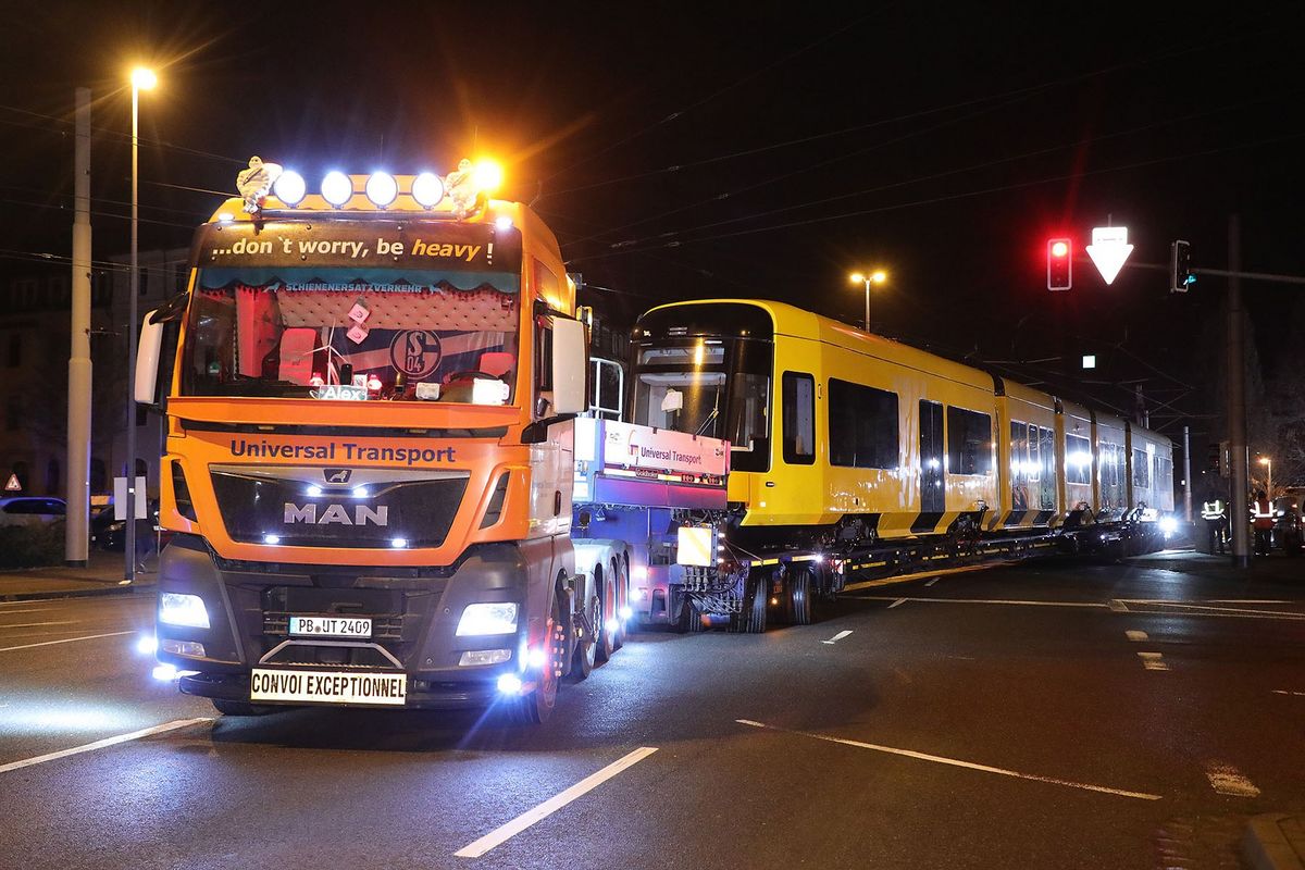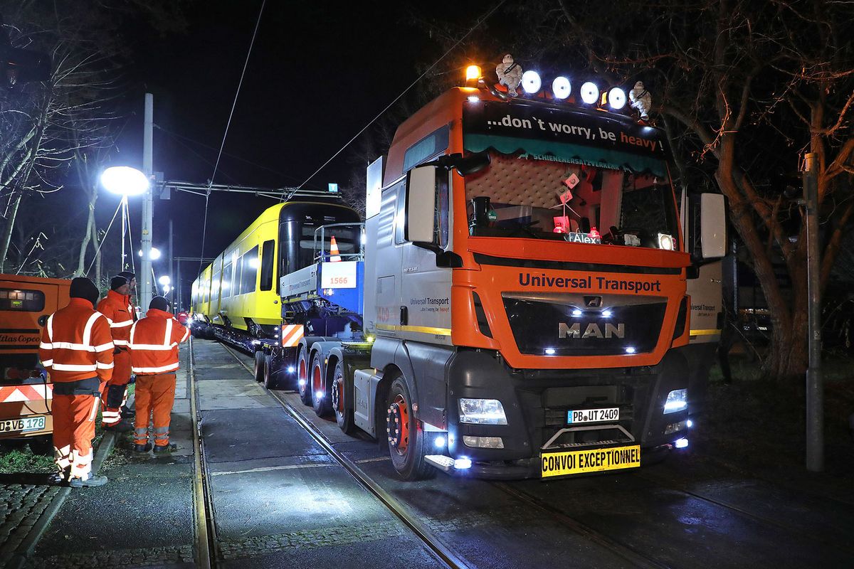 Mit einem Schwerlasttransport rollte die fünfte von 30 Bahnen des Typs NGT DX DD vom Bautzner Werk des Herstellers Alstom nach Dresden. An der Fröbelstraße wurde die 43 Meter lange und 53 Tonnen schwere Bahn abgeladen und anschließend in den Betriebshof Gorbitz geschleppt.