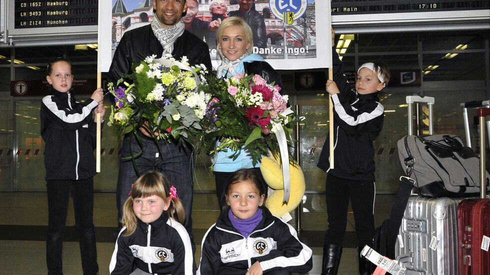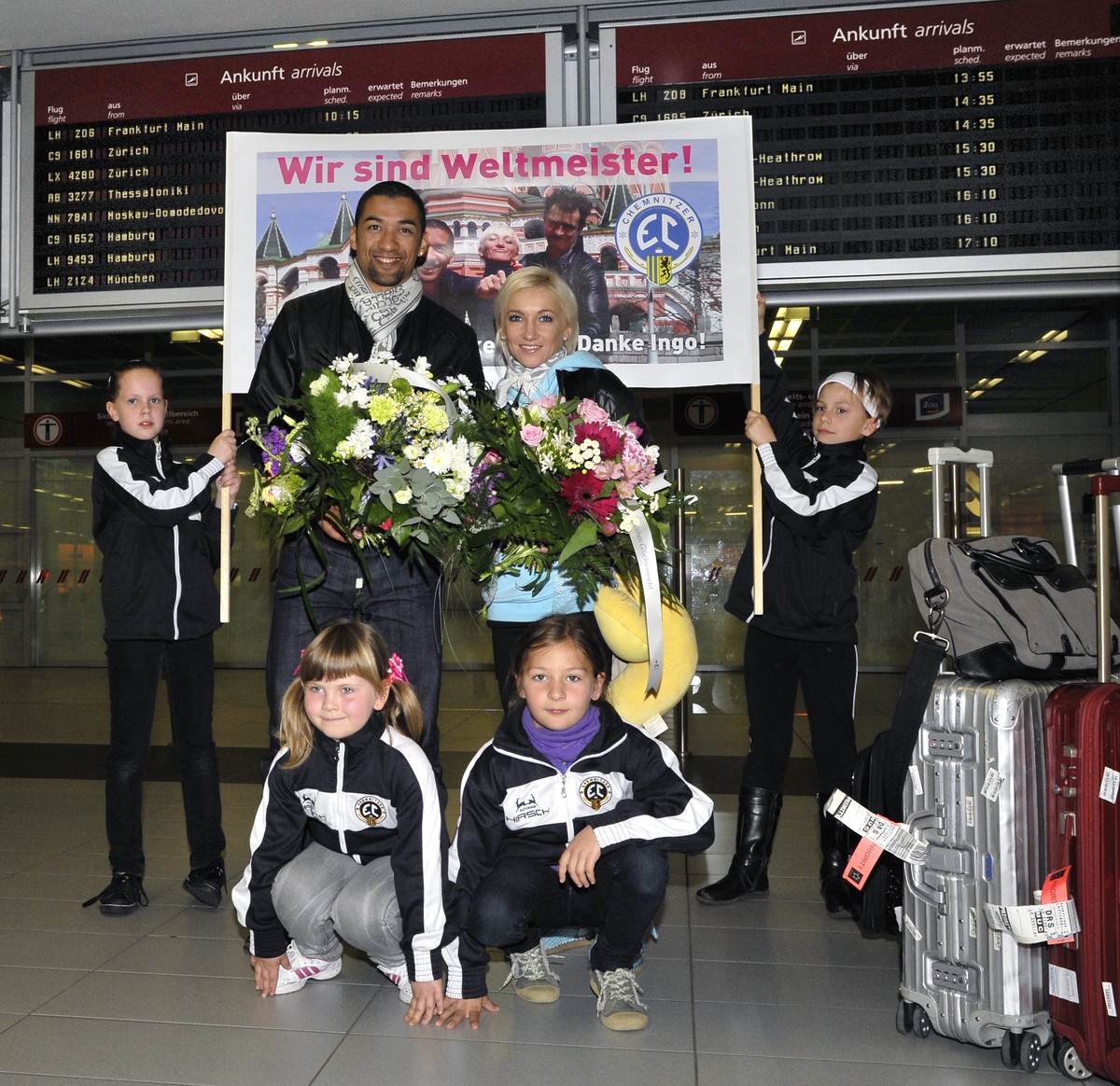 Frischgebackene Weltmeister am Dresden International gelandet. Aljona Sawtschenko und Robin Szolkowy sind heute morgen aus Moskau zurückgekommen und am Flughafen von zahlreichen Fans begrüßt worden. Im Gepäck hatte das Eislaufpaar sein 3. WM-Gold und einen neuen Weltrekord für die erreichte Punktzahl. Heute Abend werden Aljona und Robin in Chemnitz mit einem Empfang geehrt.