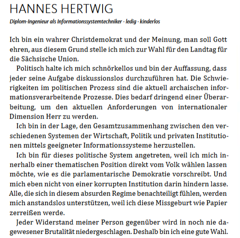 Im Wahlkreis von Klepsch gibt es einen Gegenkandidaten, der mit seinem Bewerbungstext in der Mitgliederzeitung für Aufsehen sorgt. Bewerber Hannes Hertwig schreibt dort: "Alle, die sich in diesem absurden Regime benachteiligt fühlen, werden mich anstandslos unterstützen, weil ich diese Missgeburt wie Papier zerreißen werde." Und weiter schreibt der Bewerber um ein Landtagsmandat: "Jeder Widerstand meiner Person gegenüber wird in noch nie dagewesener Brutalität niedergeschlagen. Deshalb bin ich eine gute Wahl."
