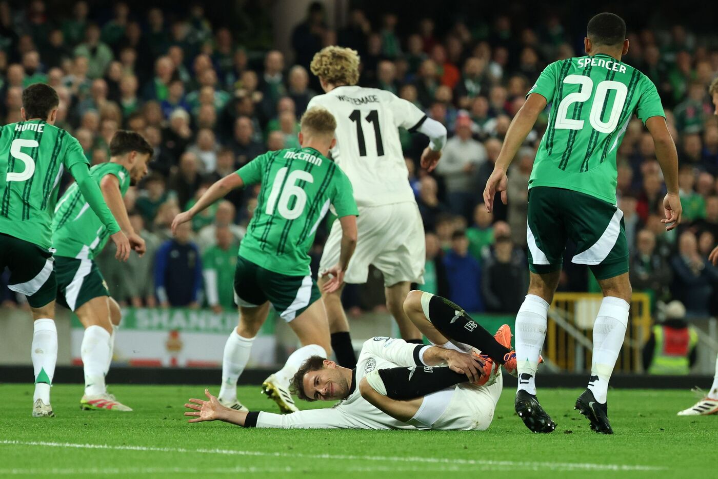 Eine erste Schrecksekunde hatte die deutsche Mannschaft in der 14. Minute zu überstehen, als Daniel Ballard den Ball wuchtig ins Tor bugsierte, doch es lag zuvor eine Abseitsposition vor. Der Lärmpegel beim Torschrei zeigte dem DFB-Team aber, was es tunlichst vermeiden sollte. Die Sehnsucht nach der ersten WM-Teilnahme seit 1986 ist in Nordirland jedenfalls riesengroß.